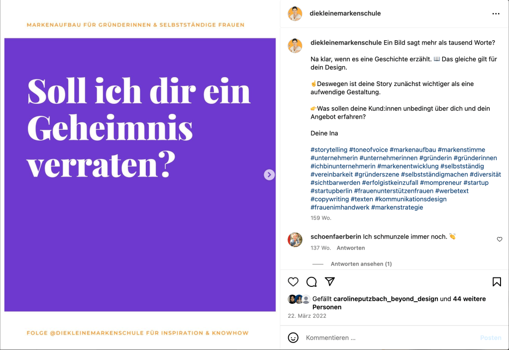 „Mit der Kombination von unfassbar großem Fachwissen und ihrer wertschätzenden und feinfühligen Art, hat sie mir ganz neu gezeigt, wie faszinierend Sprache ist. Dank Ina habe ich ein klares Markenbewusstsein, ein stimmiges Vokabular und leicht anwendbares Handwerkszeug.“