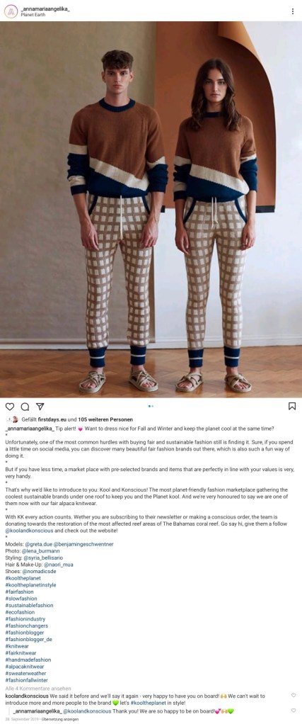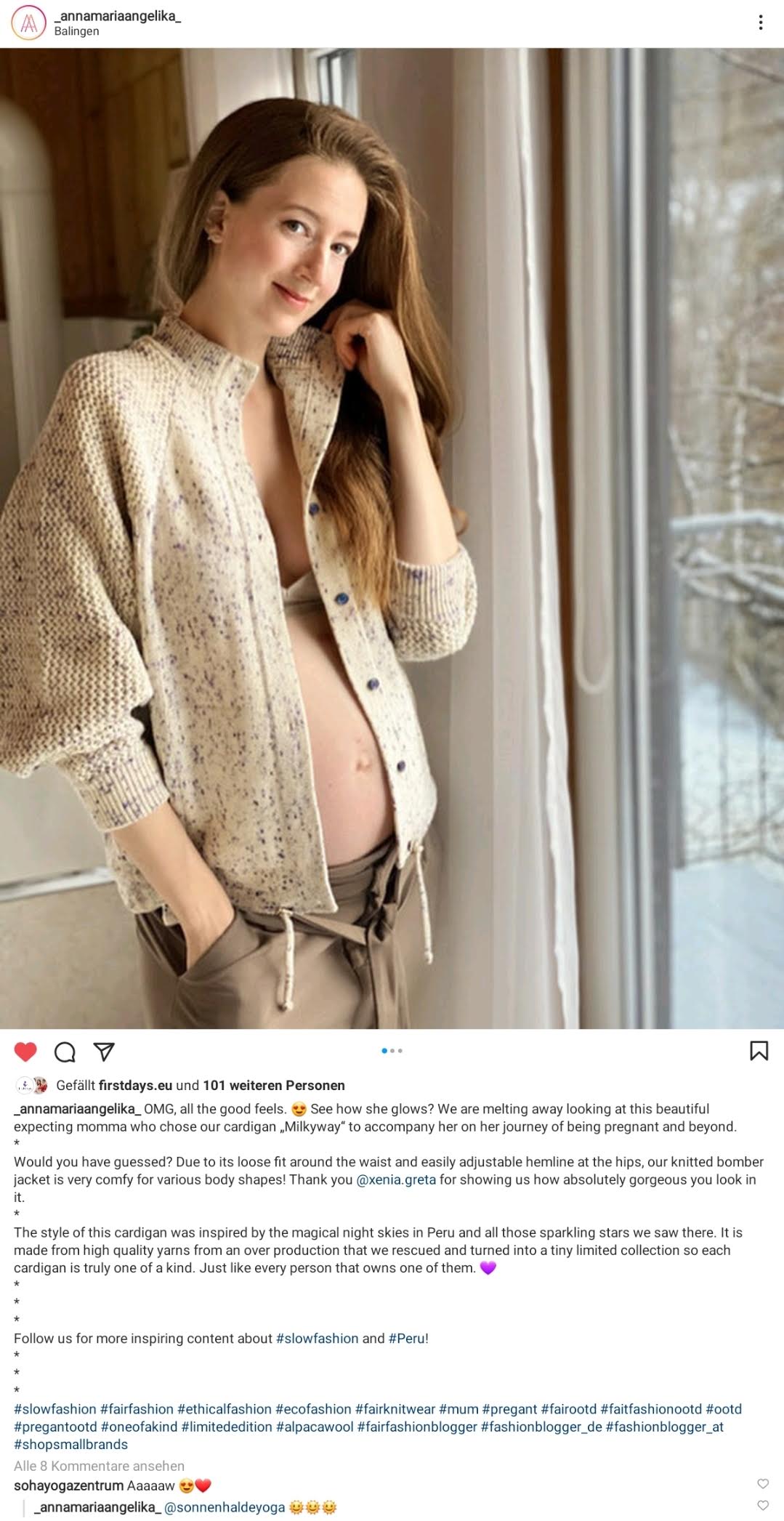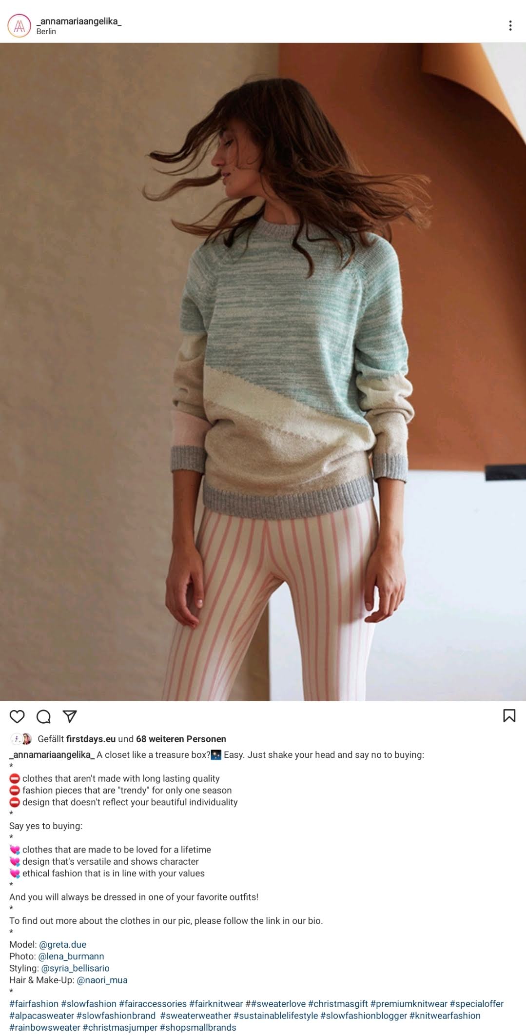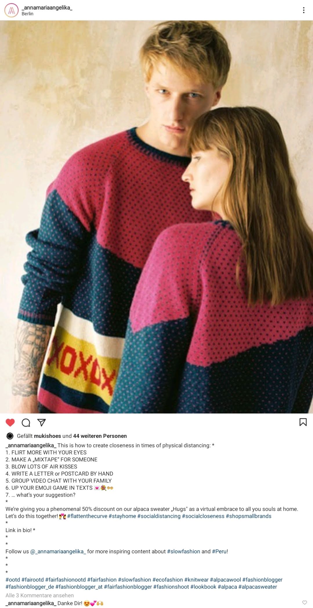 Auftraggeber: ANNAMARIAANGELIKA ist ein deutsch-peruanisches Slow-Fashion-Modelabel, dessen Kollektionen aus nachhaltigen Naturmaterialien wie Alpakawolle, Baumwolle und Seide gefertigt werden. Zur Vermeidung von Müll werden selbst Stoff- und Garnreste weiterverarbeitet. Das besondere Augenmerk der Designerin Julia Müller liegt auf der Langlebigkeit ihrer Designs.